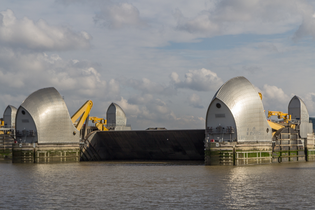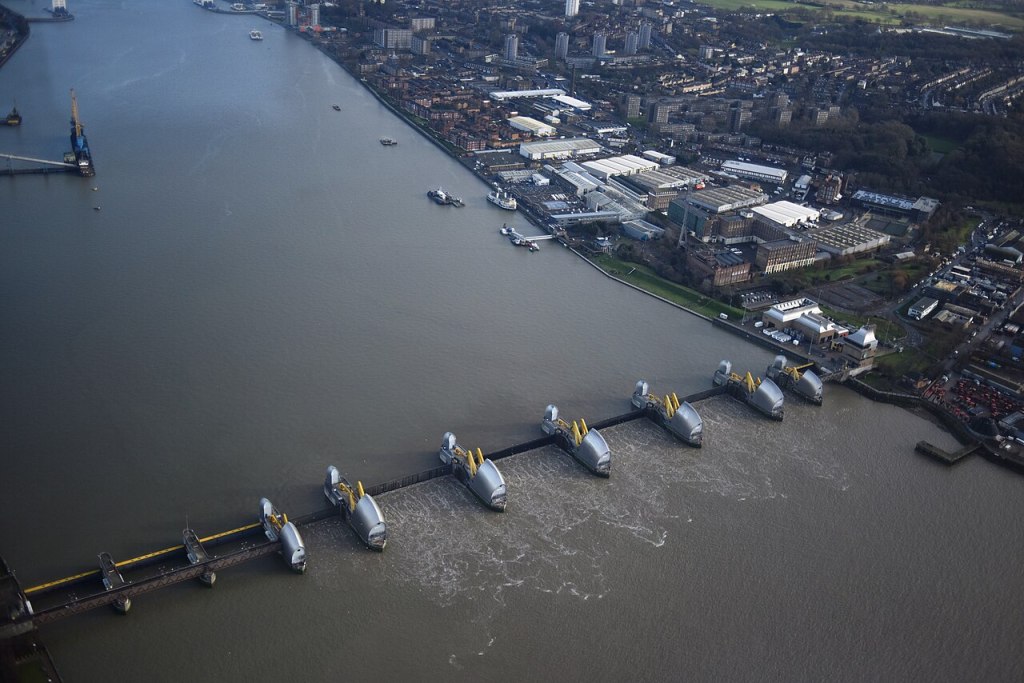 - Thames Barrier raised Environment Agency aerial photograph. Defra Data Services Platform. Open Government License v3.0.